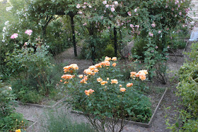 In the upper right-hand corner of that photo, you have a glimpse of the stairs that I built a few years ago, and the above-mentioned piece of geotextile. The following photo provides a view of the four northern plots, dominated for the moment by the luxurious Don Quichotte blossoms: